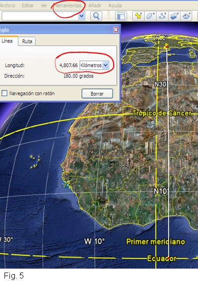 Aquesta línia no és estrictament recta perquè passa per sobre de l'esfera terrestre. Si que compleix el requisit de ser el camí més curt, per sobre de l'esfera, entre els dos punts escollits. Diem que és una geodèsica. En el nostre cas, com que és una geodèsica perpendicular a l'equador, passa per sobre d'un meridià. Al requadre "Longitud" ("Longitud")