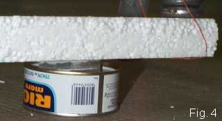 El fre d’aigua consisteix en una làmina que es projecta cap avall des de la part inferior del braç (en aquest cas, una peça d’alumini tallada amb tisores d’una safata de menjar preparat), adherida amb cola en un solc tallat a la part inferior del braç (fig. 3). La làmina es projecta dins d’un dipòsit (una llauna de tonyina) ple d’aigua (fig. 4). Com més viscós sigui el fluid, com l’oli d’amanir, més amortiment i menys oscil·lacions provoca que en el cas de l’aigua. Jo he optat per l’aigua perquè és més fàcil de netejar en cas d’inevitable bolcada.
