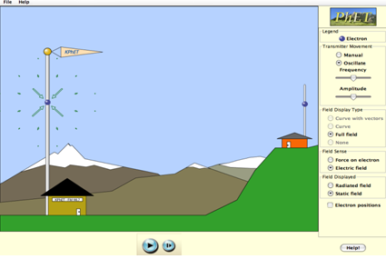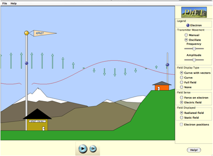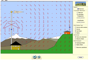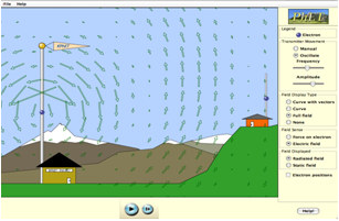 4. Una partícula carregada en repòs genera un camp elèctric i en moviment també genera un camp magnètic. Sabem que les ones de ràdio són ones electromagnètiques, tot i que en aquesta simulació només s'hi representa el camp elèctric.