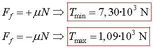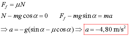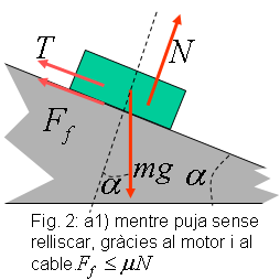 Pensem que les rodes estan bloquejades per l’acció del fre. Utilitzem uns eixos en la direcció i el sentit de la normal i la tensió. Apliquem la llei de moviment de Newton. El sentit de la fricció serà cap amunt i, com que rellisca, tindrà el valor màxim: