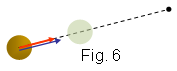 | Ara, si considerem un estat particular del sistema, no tindrà simetria sota rotacions al voltant del punt central de la força ni de cap altre punt (excepte si la massa es troba en repòs al centre de forces). Això no vol dir que no pugui tenir un tipus de simetria. Per exemple, a la figura 6 tenim un estat on la massa té una velocitat inicial que apunta cap al centre de la força. Clarament no té simetria, sota qualsevol rotació al voltant del punt central de la força. Sí que té simetria de rotació al voltant de l'eix que uneix la massa i el punt central de la força. Aquest fet ens pot servir per preveure que la massa seguirà una trajectòria per sobre de l'eix de simetria esmentat. La mateixa conclusió es podria extreure d'una manera més embolicada a partir de la conservació del moment angular. |
